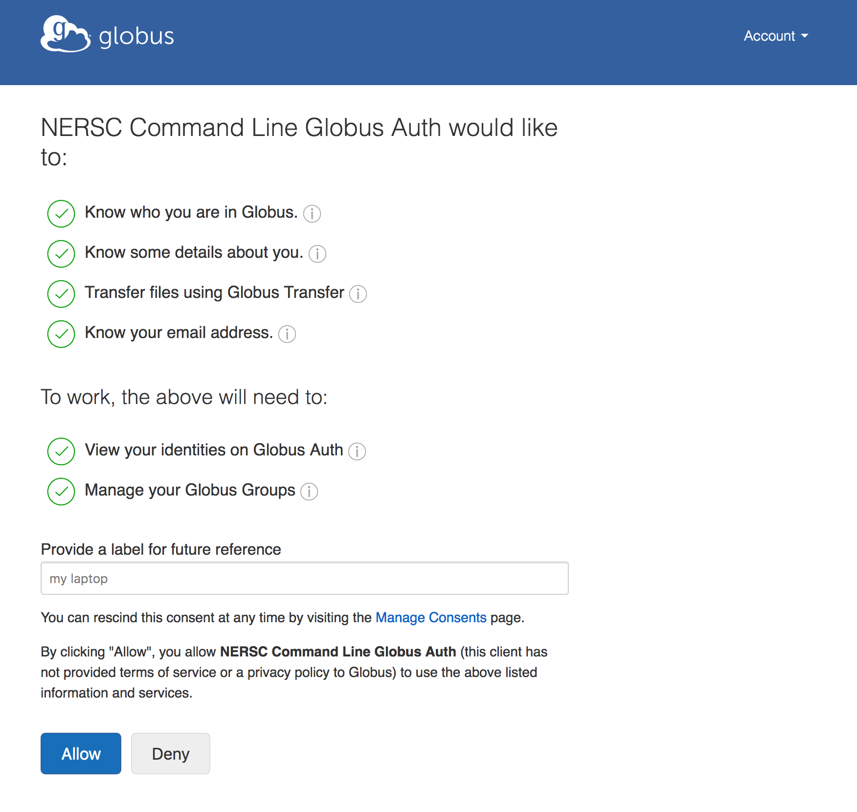 The first time you run any of these scripts, it will generate and store a Globus token in your NERSC home directory. It does this by creating a one-time Globus web page for you grant permission to generate this token. Paste this web page address into a browser and it will take you to a page where you can grant the native Globus application permission to make transfers on your behalf and check on the status of your transfers. You may get a prompt to log in to Globus first if you don't already have an active session. Once you click "Allow" it will generate a one-time code. Paste this code back into the terminal at the prompt and push return. It will use this to generate a token that can be used for this and future Globus interactions on your behalf.